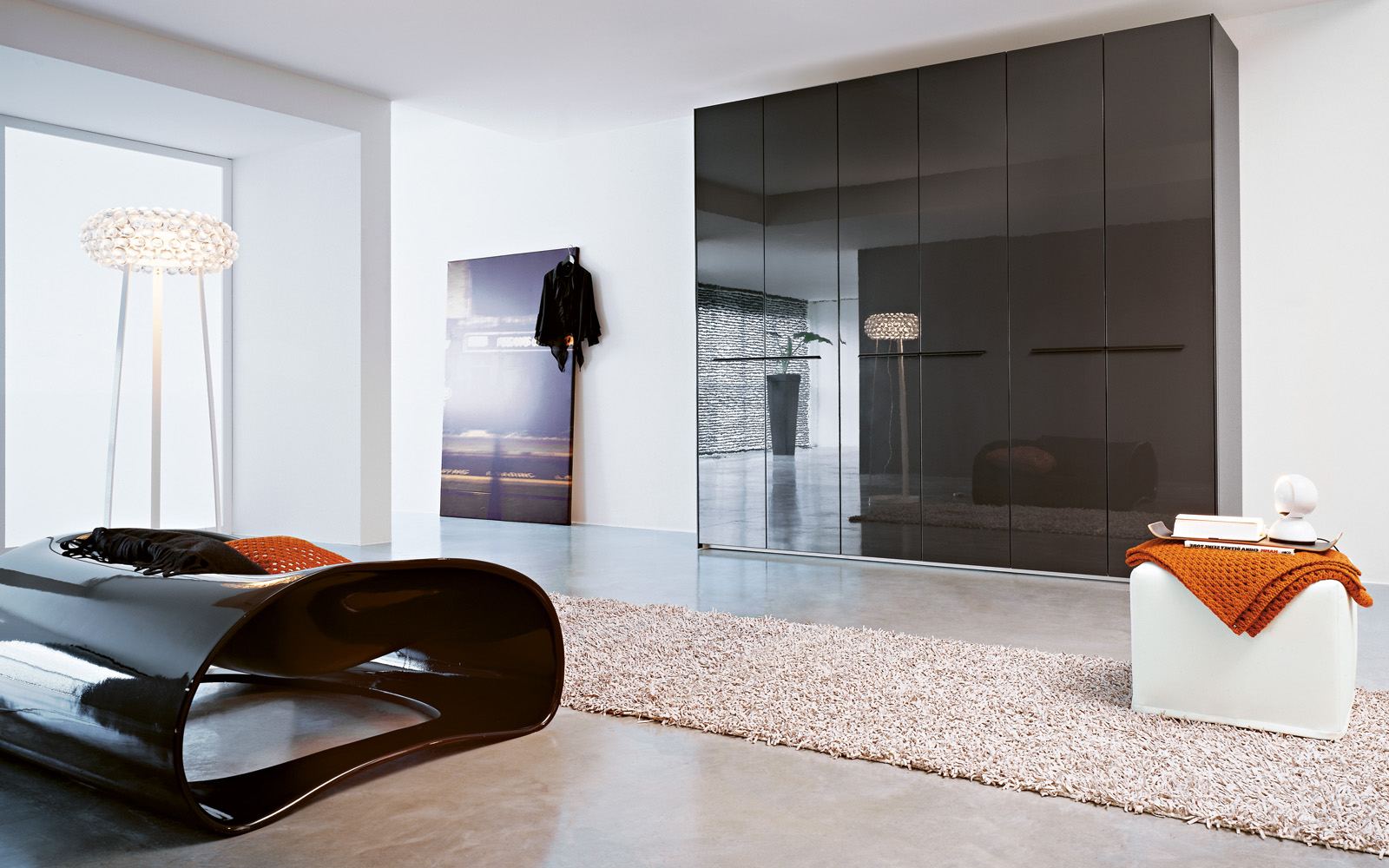 Ντουλάπα με 6 κλείστες πόρτες. Γυαλιστερό πλευρές και πόρτες απο γραφίτη. οριζόντια χάλκινη λαβή.