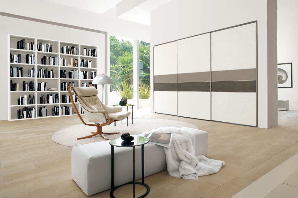 Συρόμενη πόρτα ντουλάπας απο γυαλιστερό Corda. Τρεις πόρτες Flipper με βάσεις αλουμινίου, η συρόμενη πόρτα της ντουλάπας ειναι στο χρώμα του λευκού. Στις πόρτες Flipper υπαρχουν λευκά πάνελ και στο κέντρο, μεσαίες λωρίδες απο μάυρο ματ.